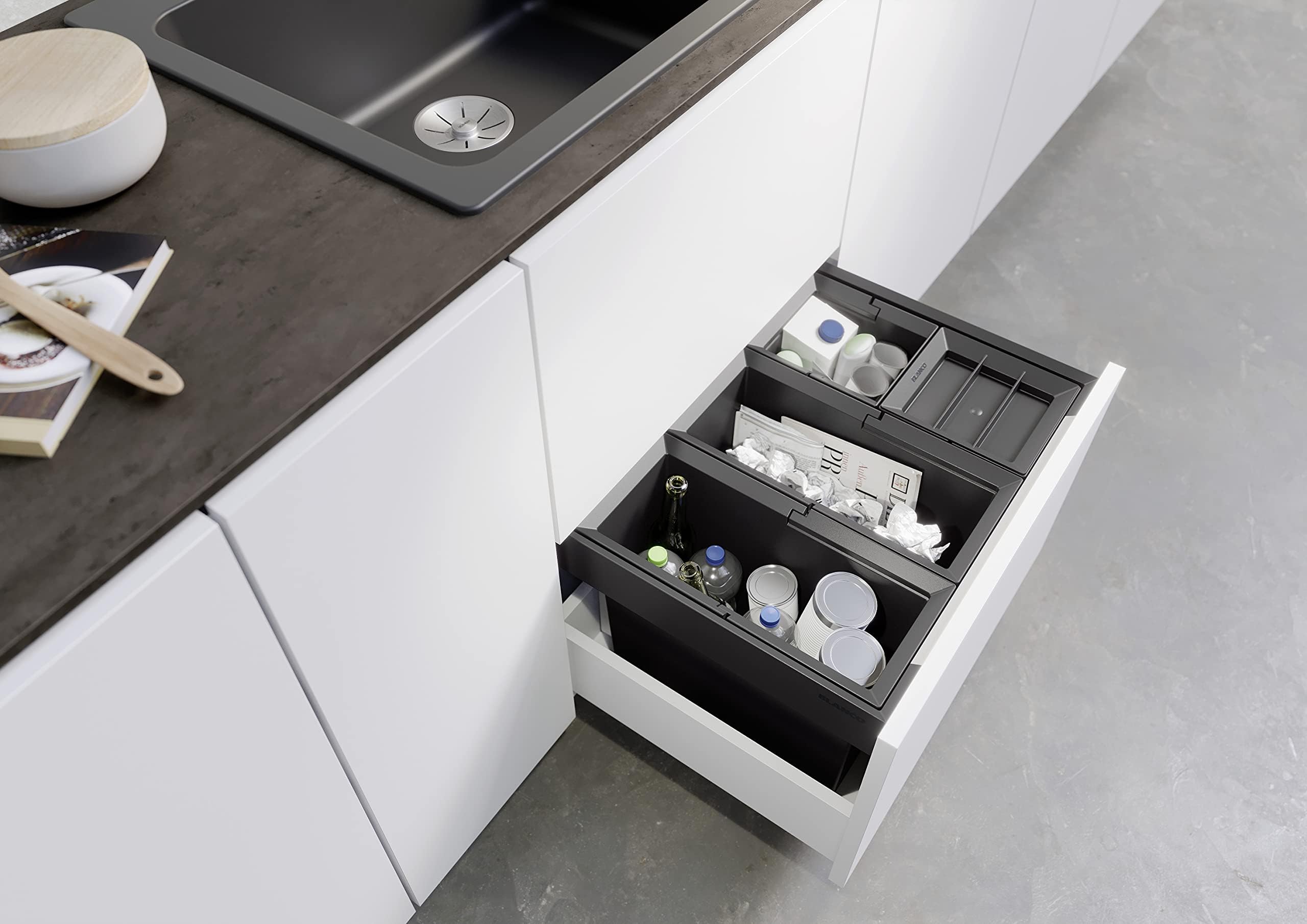 Система сортировки отходов FLEXON II LOW 60/4 от Blanco воплощает философию бескомпромиссного качества, инновационного дизайна и функциональности, превращая самое активное место на кухне в продуманный, эргономичный и эстетичный центр для приготовления пищи.