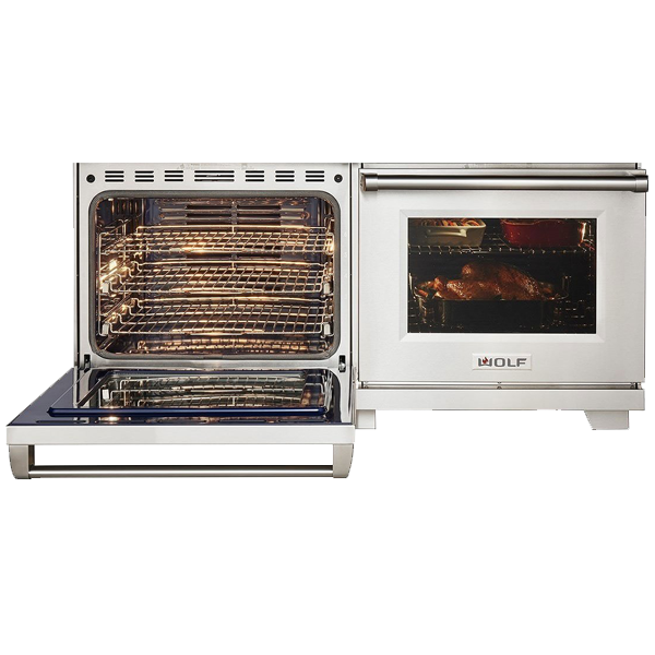 Система двойной конвекции Wolf Dual VertiCross отвечает за равномерную температуру воздуха внутри духовых шкафов посредством создания особой циркуляции горячего воздуха. Данная технология позволяет одновременно готовить на нескольких уровнях духового шкафа, а учитывая, что их два, то и в разных температурных режимах.
