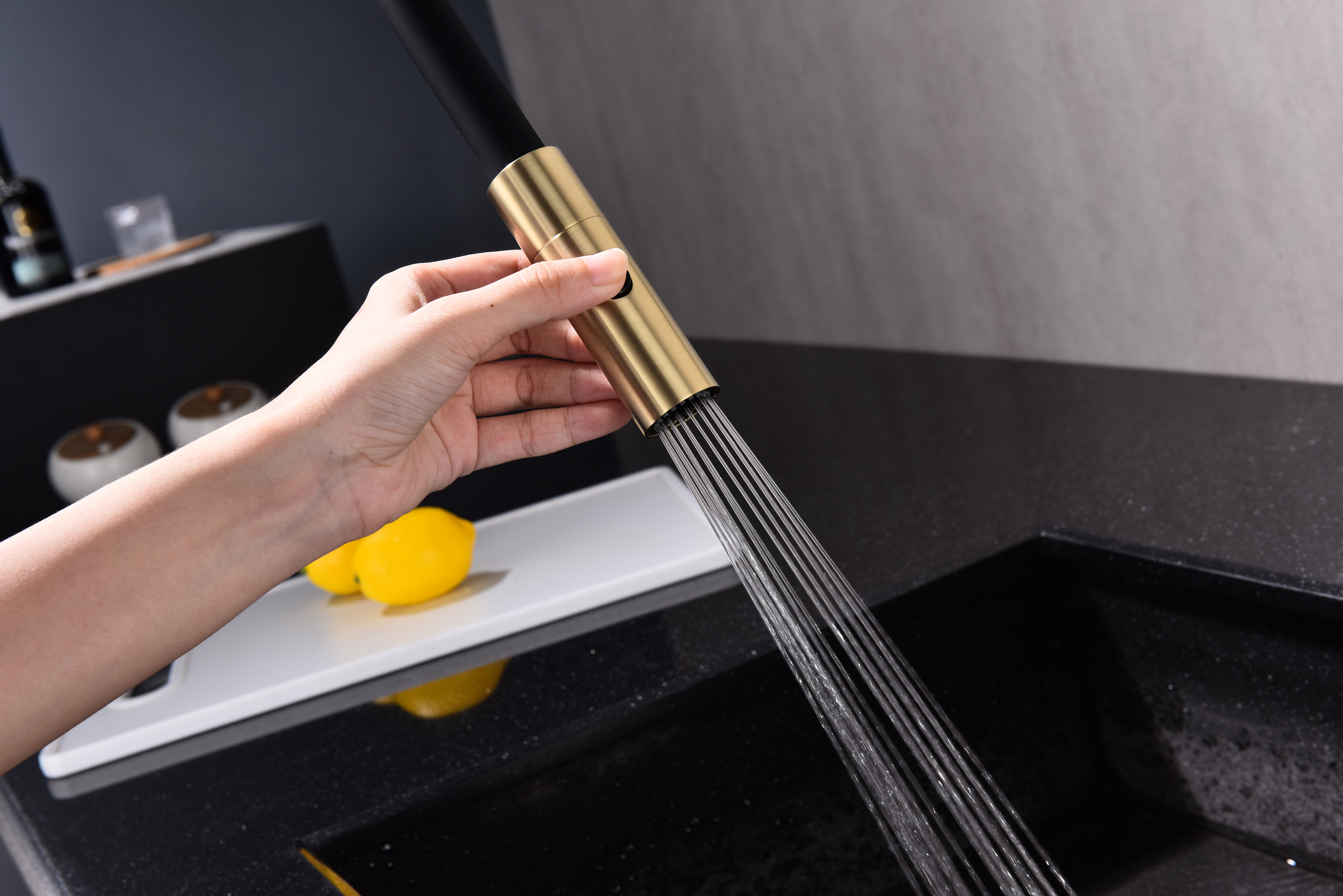 TORNADO оснащён функцией TRINKWASSER – в смесителе присутствует встроенный независимый канал для питьевой воды из фильтра, которая подается из отдельного аэратора на латунной части излива. Водопроводная вода подаётся из гибкого силиконового излива. Управление питьевой водой производится рычагом слева. Рычаг справа управляет подачей водопроводной воды. Совмещение подачи питьевой и водопроводной воды в одном смесителе избавляет от необходимости ставить дополнительный кран и позволяет сделать зону мойки максимально эстетичной.